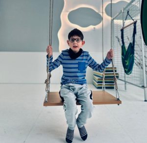 is an 11-year-old boy with a severe developmental disability who is learning to walk again after an accident and needs intensive rehabilitation.